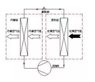 当室内温湿度都比较高,而且室内冷负荷比较大时,系统运行于降温除湿模式。此时四通阀不带电,系统按制冷方式运行,室内第二换热器支路为电磁阀关断,室外换热器为冷凝器,室内第一换热器为蒸发器。室内空气只被室内第一换热器降温除湿,成为低温低湿的空气返回室内。在这种模式下,还可以调节室外换热器的风量或水量进一步调节制冷量和除湿量,制冷量和除湿量都随着室外换热器风量或水量的增加而上升,
