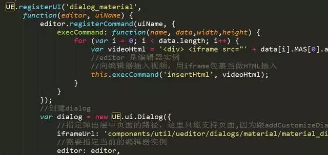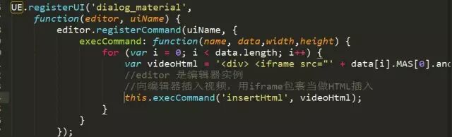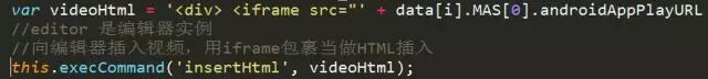 insertHtml方法通过插入iframe标签播放视频,插入第三方视频地址也是通过生成iframe标签进行播放。这里还有一个需要注意的地方,使用iframe而不是video标签的原因是,目前版本的百度编辑器对H5标签的解析还不够好,在编辑器中插入video标签,使用ue.getContent()方法得不到video标签,