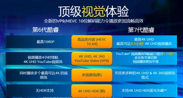 基于高质量内容(HEVC10-bit),相比第六代酷睿处理器最高支持 1080p 视频播放,这一代产品支持播放最高 4K 视频,并且能持续播放 9.5 小时。
