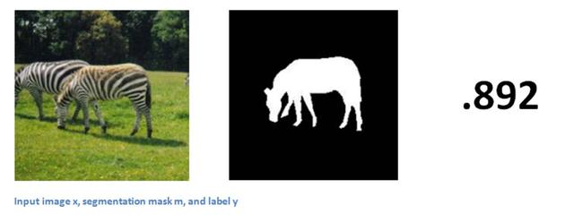 让我们先可视化出我们想让这个模型做什么。给定一个输入图像后,我们希望这个网络可以为每一个对象都输出一组掩码或轮廓。我们可以认为每一个输入图象都包含一组补丁(原图的一小部分)。对于一个输入的补丁而言,输出是一个二进制掩码,它能勾勒出主要对象的形状并对输入补丁有多少可能包括一个对象进行评分(在-1 和 1 之间)。