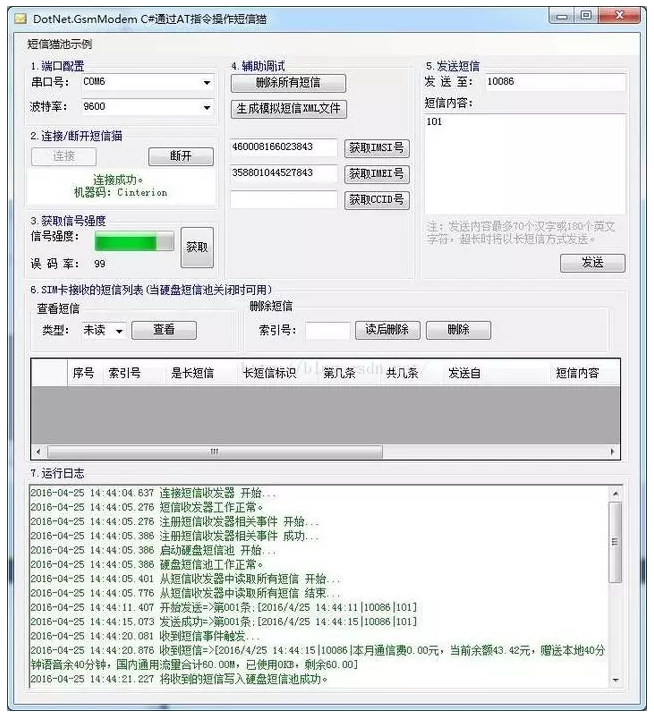 我在网上搜索了很多关于C#操作短信猫的文章、代码,都不能较完整地解决我的需求。于是我购买了3种短信猫进行测试,潜心学习短信协议,花费不少短信费进 行调试,最终确定了一款工作稳定的短信猫,并开发出了稳定版本的C#短信猫软件,已在某项目中稳定运行了一年多,并已在几位网友的不同项目中正常使用。