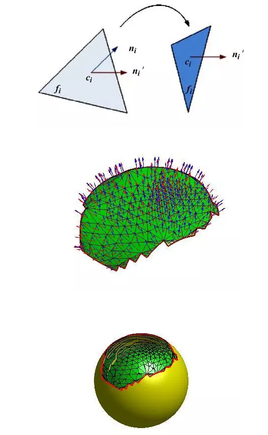 计算得到补洞网格中顶点的期望法向之后,可以进一步求得三角面片的期望法向,三角面片的期望法向是其三个顶点期望法向的平均值,然后补洞网格中所有的三角面片根据期望法向进行旋转。旋转参数计算方法如下:假设ni、ni’和ci为三角面片fi的原始法向、期望法向和重心位置,ni与ni’的叉乘方向a为三角面片fi的旋转轴方向,ni与ni’之间的夹角φ为三角面片fi的旋转角度,那么三角面片fi将以ci为旋转中心,绕旋转轴a旋转角度φ到新的位置。