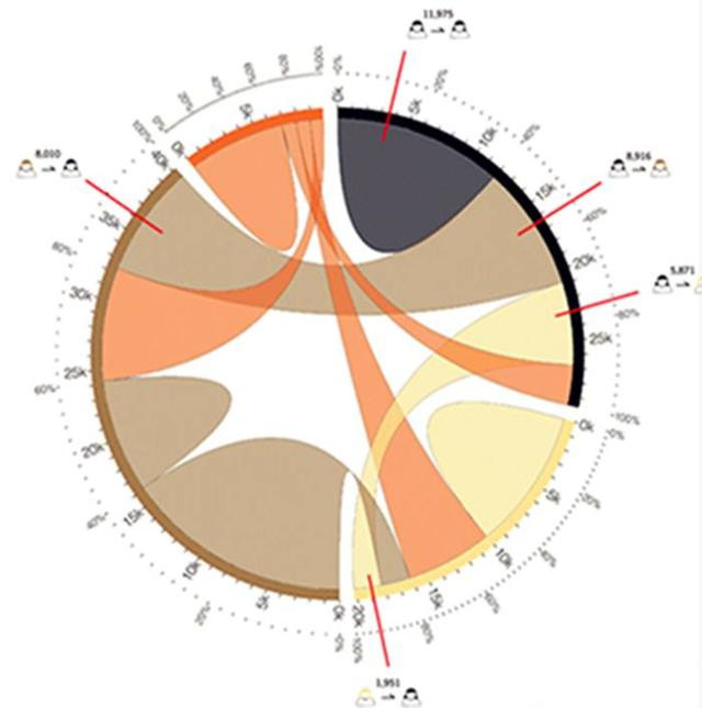 图例说明——用于表示数据间的关系和流量。外围不同颜色圆环表示数据节点,弧长表示数据量大小。内部不同颜色连接带,表示数据关系流向、数量级和位置信息,连接带颜色还可以表示第三维度信息。首尾宽度一致的连接带表示单向流量(从与连接带颜色相同的外围圆环流出),而首尾宽度不同的连接带表示双向流量。外层加入比例尺,还可以一目了然的发现数据流量所占比例。