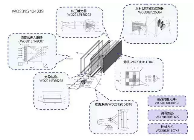 SEEREAL基于自己独特的设计思路,对整套全息显示设备进行了全方面的专利保护。上图仅示例性地说明了SEEREAL对全息显示设备各部件进行的专利布局。