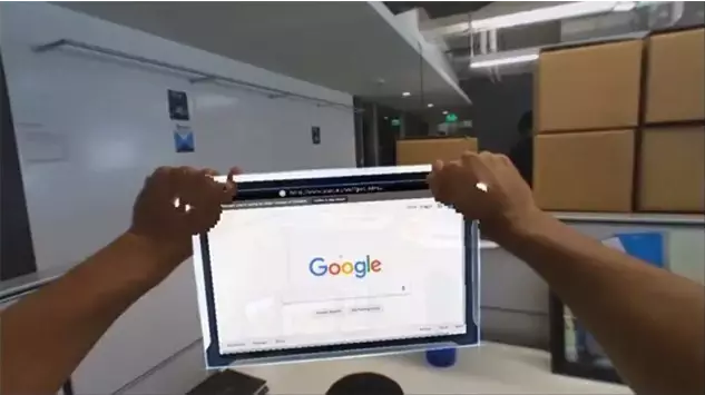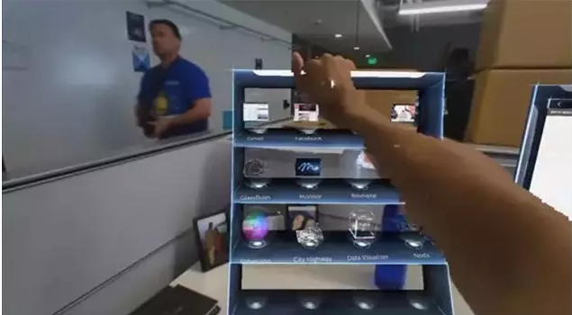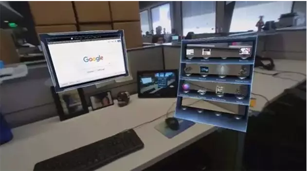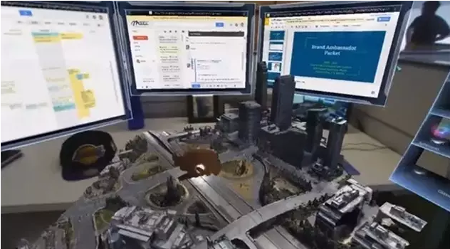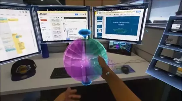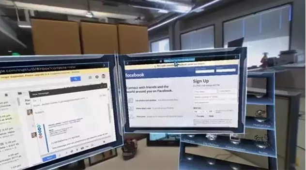 试想一下,整个办公室的电脑显示器都消失了,每个人都戴着一个透明面罩的头戴设备,外加一个懒人沙发,躺着用手操作3D模型、浏览网页、发送电子邮件,甚至在悬浮的虚拟屏幕上敲代码...