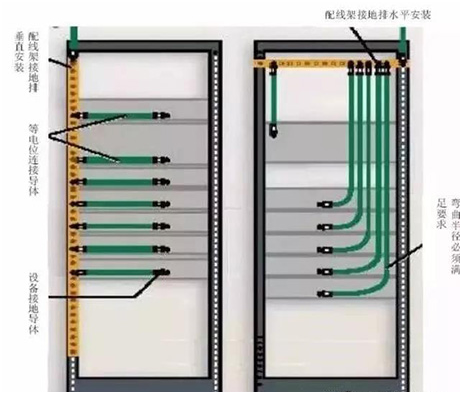 2. 机柜底部安装接地铜排,并使用独立的接地导线将接地铜排连接到配线间(电信间)的接地桩(接地铜排)上,使各个机柜之间的接地形成星型接地结构;