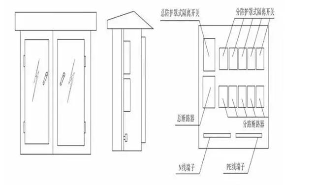 总配电箱内电器元件设置根据漏电断路器在总路或支路具体有两种配置: