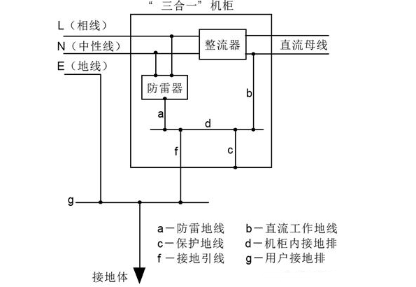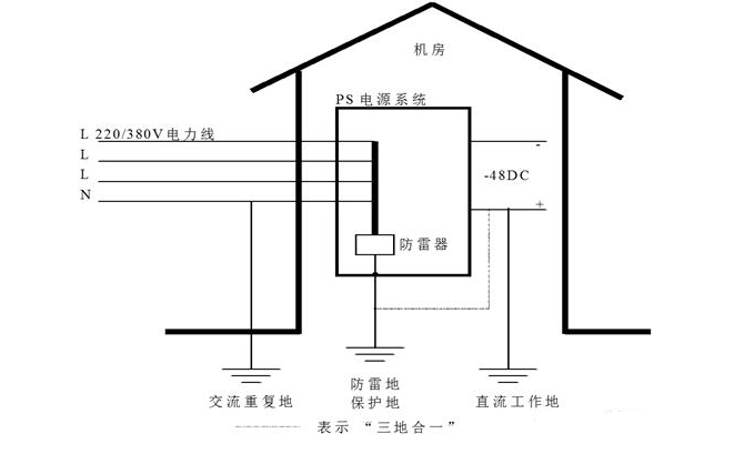 联合接地为三地合一,包括直流工作地、防雷接地、保护接地。