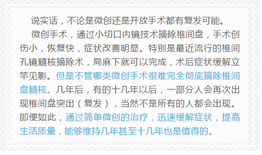 常听人说,我有“椎间盘突出”。有的人甚至“突出”很多年,到处就医,对其治疗方法了如指掌,想保守治疗,尽量不做手术。 患者最大的担心就是:1、手术万一不成功,瘫痪了怎么办? 2、手术做完后,万一复发怎么办?