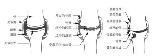 骨关节炎,主要是由于膝关节软骨半月板被过度使用,磨得又薄又粗糙,表面出现裂痕,导致的骨膜发炎。更严重一点,当半月板被彻底磨没了,股骨胫骨之间没有缓冲垫,直接摩擦增厚增生,就更疼痛难耐……