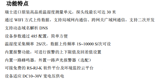 产品采用中文液晶显示,具有温湿度上下限双控,限值自由设置,温度、湿度凭密码校准等功能,内部集成报警模块(蜂鸣器),可实现高、低温报警和高、低湿报警。产品采用瑞士进口原装高品质温湿度测量单元,具有测量精度高,抗干扰能力强等特点,保证了产品的优异测量性能。