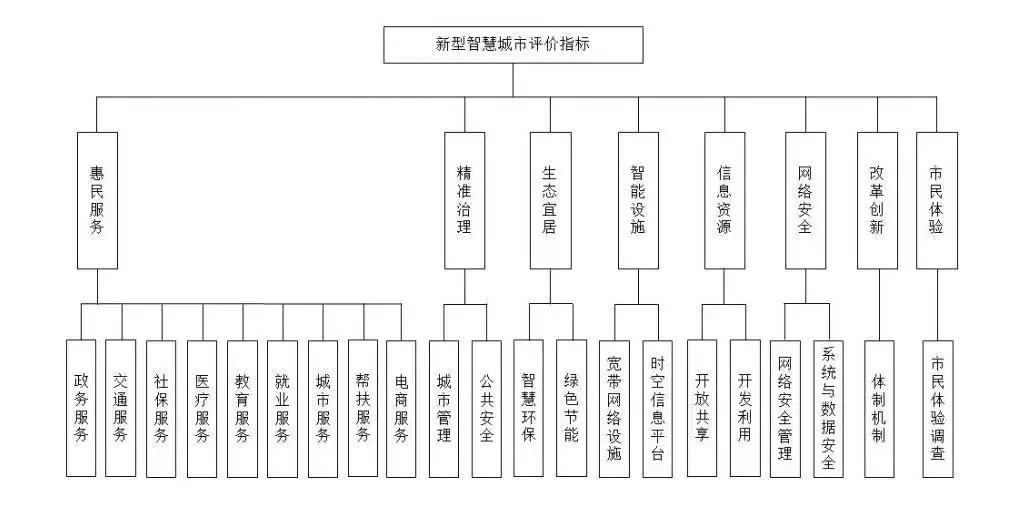 其中,《智慧城市——技术参考模型》指出了智慧城市概念参考框架,规定了信息通信技术支撑的智慧城市业务框架、知识管理参考模型和技术参考模型,以及智慧城市建设的技术原则和要求。《新型智慧城市评价指标》包括惠民服务、精准治理、生态宜居、智能设施、信息资源、网络安全、改革创新以及市民体验等8个一级评价指标(图1),是开展新型智慧城市评价工作的主要依据,是引导中国各地新型智慧城市健康发展的重要手段。