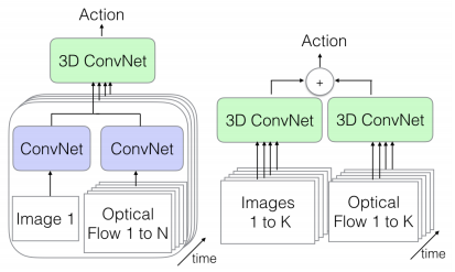 (2)我们还可以在一个流(数据的空间信息)中传递单个图像帧,并从视频(数据的时间信息)中传递其相应的光流表示。我们将使用常规的2D CNNs从两者中提取特征,然后将它们组合起来传递给我们的3D CNN,它将组合这两种类型的信息