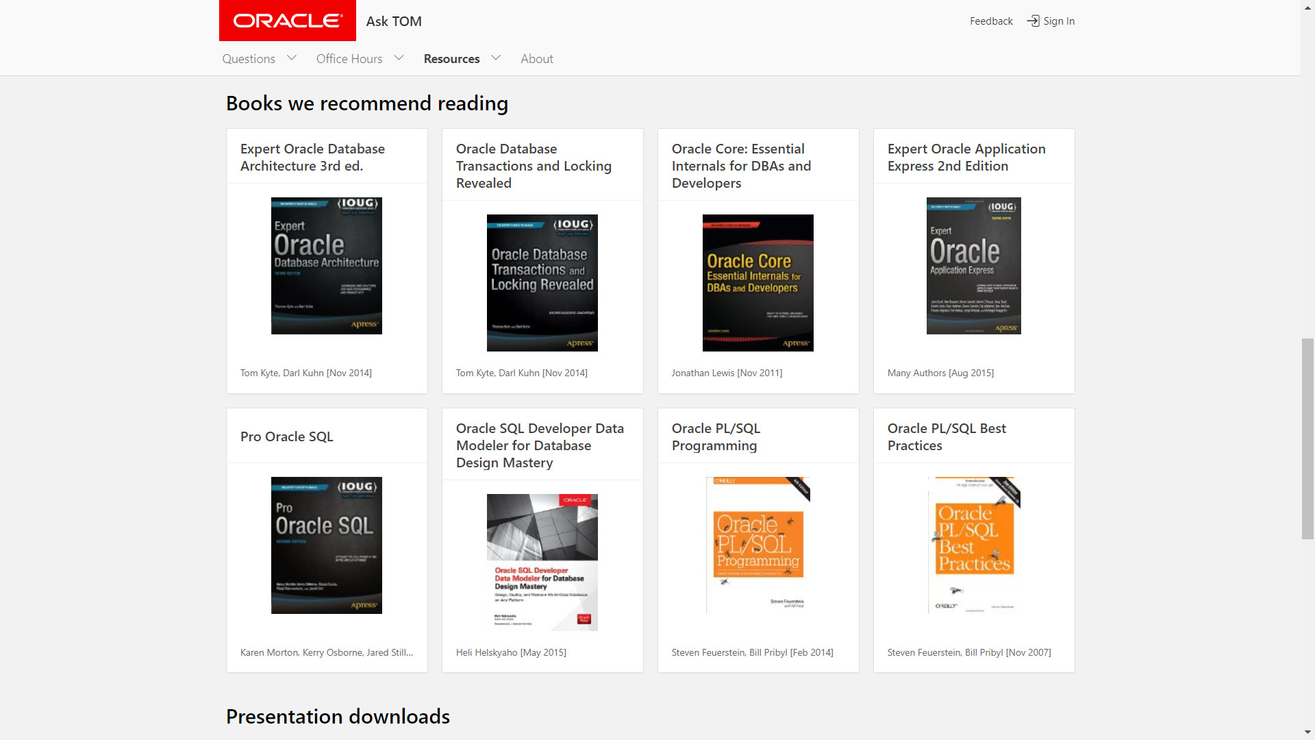 除了问题解答外,在Resources菜单下也提供了很多有用的资源,如网站,书籍和PPT。推荐的网站中大部分来自于Oracle Blogs和Youtube频道,当然还有大家常用的support.oracle.com。