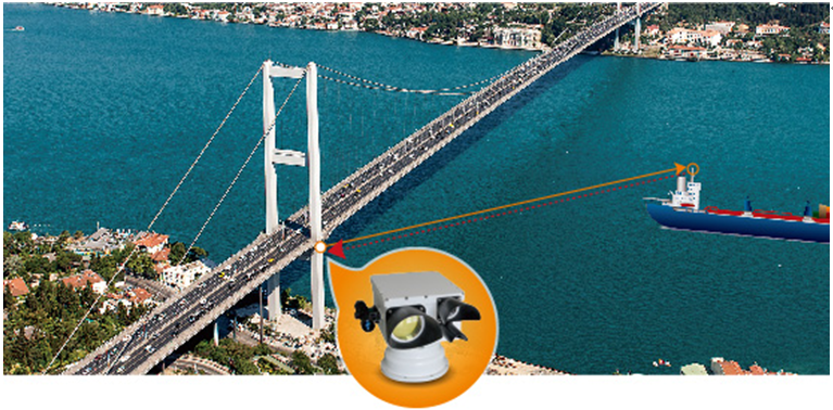 本系统安装于桥上对超高船只进行预警,以避免船撞桥事故。本系统核心为一台激光雷达,安装在桥梁特定位置和高度,利用激光对通航水域内危险目标进行扫描,在一定距离内发现对桥梁安全构成威胁的目标船只,并测量船只的方位、距离、高度,提前发出告警信息,此信息通过高音喇叭和LED大屏向超高船只发出警告,同时在监控大厅内显示预警信息,收到预警后海事执法部门和桥梁养护人员及时处置,保证桥梁安全。